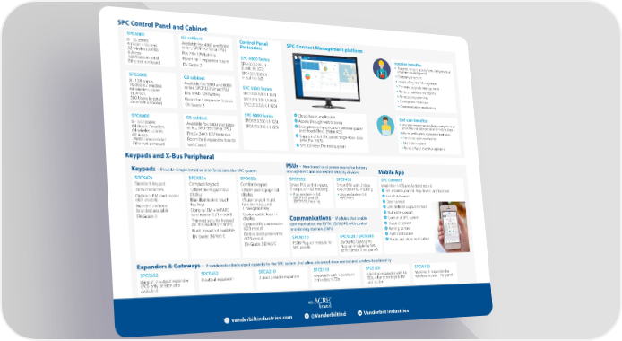 SPC Control Panel and Cabinet SPC Connect Management platform Keypads and X-Bus Peripheral SPCK42x Standard keypad 2x16 characters Optional EM card reader (421 model) Branded and non branded available EN Grade 3 Keypads - Provide simple intuitive interfaces into the SPC system SPCK52x Compact keypad 128x64 pixels graphical display Blue illuminated touch key keys Optional EM + MIFARE card reader (521 model) Thinnest security keypad on the market (17.5mm) Flush mount kit available EN Grade 3 & VdS C SPCK62x Comfort keypad 128x64 pixels graphical display 15 user keys, 4 multi function keys and 1 navigation key Customizable logo in display Optional EM card reader (623 model) Embedded speaker/mic (623 model) EN Grade 3 & VdS C Expanders & Gateways - Provide extended output capacity to the SPC system, Including advanced door control and wireless functionality SPCE452 8 output expander SPCE652 8 input, 2 output expander (PCB only version also available) SPCE110 Keyswitch with 3 positions 2 tri-colour LEDs SPCE120 Indication expander with 16 LEDs, 4 function keys & EM card reader SPCW120 Wireless RF expander for wireless devices - for panel SPCP332 Smart PSU with 8 inputs, 2 outputs in G2 housing • Also available in G3 (SPCP333) and G5 (SPCP355) housing PSUs - Monitored local power source for battery management and connected security devices SPCP432 Smart PSU with 2 door expander in G2 housing • Also available in G3 (SPCP433) SPCN110 PSTN Plug-on module for SPC panels Communications - Modules that enable communication via PSTN, 2G/3G/4G with central monitoring stations (CMS) SPCN320 / SPCN340 2G/3G/4G GSM/GPRS Plug-on module for SPC panels (max. 2 per panel) Mobile App SPC Connect (available in iOS and Android stores) Set, monitor, control. Any device, any location Search & browse Door control User defined output control Multi-site support Control of SPC system Status of system Arming control Push notification Audio and video verification SPC4000 8 - 32 zones 4 doors / readers 32 wireless zones 4 Areas 100 Users in total Ethernet onboard G2 cabinet Available for: 4000 and 5000 series, SPCP332 Smart PSU Fits 7Ah 12V battery Room for 1 expander board EN Grade 2 SPC5000 8 - 128 zones 16 doors / readers 64 wireless zones 16 Areas 500 Users in total Ethernet onboard G3 cabinet Available for: 5000 and 6000 series, SPCP333 Smart PSU Fits 17Ah 12V battery Room for 4 expander boards EN Grade 3 SPC6000 8 - 512 zones 64 doors / readers 64 wireless zones 60 Areas 2500 Users in total Ethernet onboard G5 cabinet Available for: 5000 and 6000 series, SPCP355 Smart PSU Fits 2x 24Ah 12V batteries Room for 6 expander boards VdS Class C Control Panel Partcodes: SPC 4000 Series SPC4320.220-L1 - plastic lid (G2) SPC4320.320-L1 - metal lid (G2) SPC 5000 Series SPC5320.320-L1 (G2) SPC5330.320-L1 (G3) SPC5350.320-L1 (G5) SPC 6000 Series SPC6330.320-L1 (G3) SPC6350.320-L1 (G5) SPCA210 2 door / reader expander vanderbiltindustries.com @VanderbiltInd Vanderbilt Industries Cloud-based application Access through web browser Encrypted communication between panel and cloud (FlexC 256bit AES) Support of full SPC panel range 4xxx- 6xxx (min. Fw .3.8.5) SPC Connect Pro tool support Installer benefits: • Secured remote access from everywhere at any time via Web portal • Company structure • Installer/Engineer Management • Firmware upgrade management • Remote maintenance reports • Remote programming • Configuration backups • Communication monitoring End user benefits: • Secured remote access from everywhere at any time via Web portal and mobile App. • Alarm verification via mobile (optional) • Email and push notification • Multi-site support • Remote Panel User Management