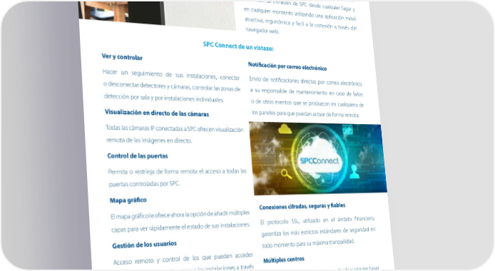 SPC Connect de un vistazo: Vanderbilt International Ltd. Clonshaugh Business and Technology Park Clonshaugh, Dublin 17, Irlanda +353 (01) 437 2560 Ver y controlar Hacer un seguimiento de sus instalaciones, conectar o desconectar detectores y cámaras, controlar las zonas de detección por sala y por instalaciones individuales. Visualización en directo de las cámaras Todas las cámaras IP conectadas a SPC ofrecen visualización remota de las imágenes en directo. Control de las puertas Permita o restrinja de forma remota el acceso a todas las puertas controladas por SPC. Mapa gráfico El mapa gráfico le ofrece ahora la opción de añadir múltiples capas para ver rápidamente el estado de sus instalaciones. Gestión de los usuarios Acceso remoto y control de los que pueden acceder de forma remota a su sistema y a las instalaciones a través de Internet o de la aplicación móvil. www.vanderbiltindustries.com @VanderbiltInd Vanderbilt Industries Notificación por correo electrónico Envío de notificaciones directas por correo electrónico a su responsable de mantenimiento en caso de fallos o de otros eventos que se produzcan en cualquiera de los paneles para que puedan actuar de forma remota. Conexiones cifradas, seguras y fiables El protocolo SSL, utilizado en el ámbito financiero, garantiza los más estrictos estándares de seguridad en todo momento para su máxima tranquilidad. Múltiples centros Gestione fácilmente varios centros desde cualquier lugar remoto y cambie entre las ubicaciones a voluntad. Con SPC Connect , asuma el control del sistema de detección de intrusión desde donde quiera que esté. Como usuario del sistema, puede acceder a las potentes interfaces que le permiten controlar el sistema de detección de intrusión de SPC desde cualquier lugar y en cualquier momento utilizando una aplicación móvil atractiva, ergonómica y fácil o la conexión a través del navegador web.