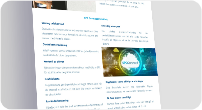 SPC Connect i korthet: Vanderbilt International Ltd. Clonshaugh Business and Technology Park Clonshaugh, Dublin 17, Irland +353 (01) 437 2560 Visning och kontroll Övervaka dina lokalers status, aktivera eller deaktivera dina detektorer och kameror, kontrollera detektionszoner per rum och individuella lokaler. Direkt kameravisning Alla IP-kameror som är anslutna till SPC erbjuder fjärrvisning av direktsända bilder dygnet runt. Kontroll av dörrar Fjärraktivering av dörrar som kontrolleras med hjälp av SPC för att tillåta eller begränsa åtkomst. Grafisk karta En grafisk karta ger dig möjlighet att lägga på flera lager när du tittar på installationen och låter dig snabbt se statusen för dina lokaler. Användarhantering Fjärråtkomst och -kontroll av vem som kan fjärransluta till ditt system och dina lokaler via Internet eller mobilapp. www.vanderbiltindustries.com @VanderbiltInd Vanderbilt Industries Avisering via e-post Ger direkta e-postmeddelanden till din underhållsentreprenör om fel eller andra händelser inträffar på någon av så att de kan vidta åtgärder på distans. Krypterade, säkra, pålitliga anslutningar Den finansiella klassen SSL säkerställer högsta säkerhetsstandard när som helst för fullständig sinnesro. På flera platser samtidigt Hantera flera platser från vilken plats som helst på ett enkelt sätt och växla mellan platser när du vill. SPC Connect ger dig kontroll över ditt var du än befinner dig. I egenskap av systemanvändare, kan du använda en attraktiv, ergonomisk och användarvänlig mobilapplikation eller webbläsaranslutning som ger dig ett kraftfullt gränssnitt för att styra ditt SPC- inbrottslarmsystem var som helst, när som helst.