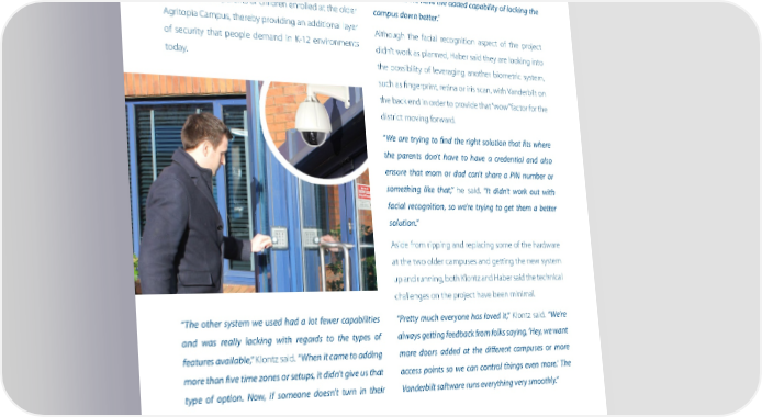Vanderbilt Industries 2 Cranberry Road Parsippany, NJ 07054 973 316 3900 vanderbiltindustries.com @VanderbiltInd Vanderbilt Industries And while the schools don’t provide credentials to students, Klontz said they do issue four-digit PIN numbers to the parents of children enrolled at the older Agritopia Campus, thereby providing an additional layer of security that people demand in K-12 environments today. key when they leave, it is easy to deactivate them in the system and we have the added capability of locking the campus down better. ” Although the facial recognition aspect of the project didn’t work as planned, Haber said they are looking into the possibility of leveraging another biometric system, such as fingerprint, retina or iris scan, with Vanderbilt on the back end in order to provide that “wow” factor for the district moving forward. “We are trying to find the right solution that fits where the parents don’t have to have a credential and also ensure that mom or dad can’t share a PIN number or something like that,” he said. “It didn’t work out with facial recognition, so we’re trying to get them a better solution.” Aside from ripping and replacing some of the hardware at the two older campuses and getting the new system up and running, both Klontz and Haber said the technical challenges on the project have been minimal. “Pretty much everyone has loved it,” Klontz said. “ We’re always getting feedback from folks saying, ‘Hey, we want more doors added at the different campuses or more access points so we can control things even more.’ The Vanderbilt software runs everything very smoothly.” “The other system we used had a lot fewer capabilities and was really lacking with regards to the types of features available,” Klontz said. “When it came to adding more than five time zones or setups, it didn’t give us that type of option. Now, if someone doesn’t turn in their