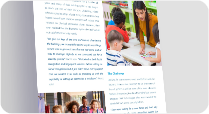 According to Barry Klontz, IT Manager, Gilbert Christian Schools, the district’s Agritopia and high school campuses were already in operation for a number of years and many of their existing systems had begun to reach the end of their lifecycle. Ultimately, school officials opted to adopt a facial recognition solution they hoped would both improve security and reduce their reliance on physical credentials alone. However, they soon realized that the biometric system by itself would not satisfy their security needs. “We give out keys all the time and instead of re-keying the buildings, we thought the easiest way to keep things secure was to give out keys that we had some kind of way to manage digitally so we contracted out for a security system,” Klontz says. “We looked at both facial recognition and fingerprint solutions before settling on facial recognition but it just didn’t serve every purpose that we wanted it to, such as providing us with the capability of setting up alarms for a lockdown,” Klontz said. The Challenge Looking for someone who could provide them with the backend infrastructure necessary to run their state-of- the-art system as well as some of the more advanced features they desired, the district turned to local systems integrator 365 Technologies who recommended the Vanderbilt SMS access control platform. “They were looking for a wow factor and that’s why they went with the facial recognition system but unfortunately, the company that sold the system to them sold them just the facial recognition part and not the engine behind it which is the access control system,” said Freddie Haber, President, 365 Technologies.